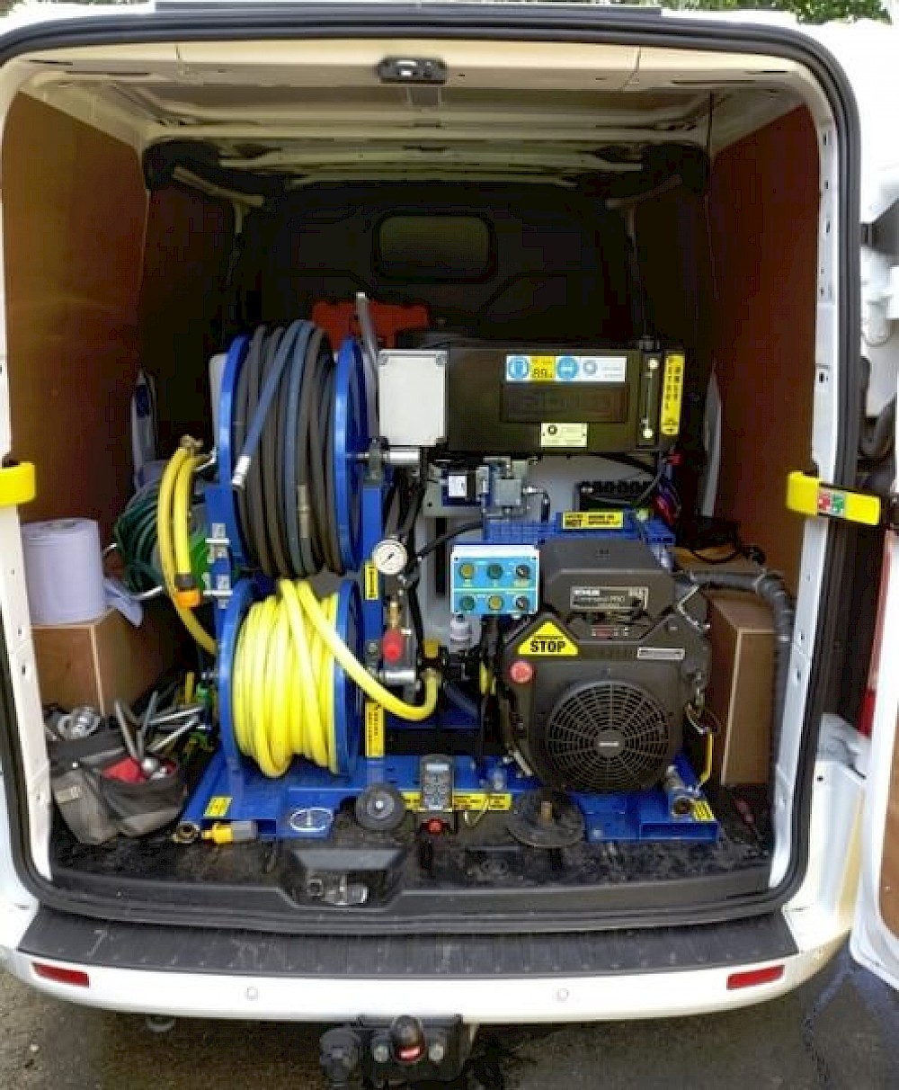 Our high pressure water jetter works at 3000psi and flows at 8 GPM. It can be operated manually via the control panel or using radio remote.
